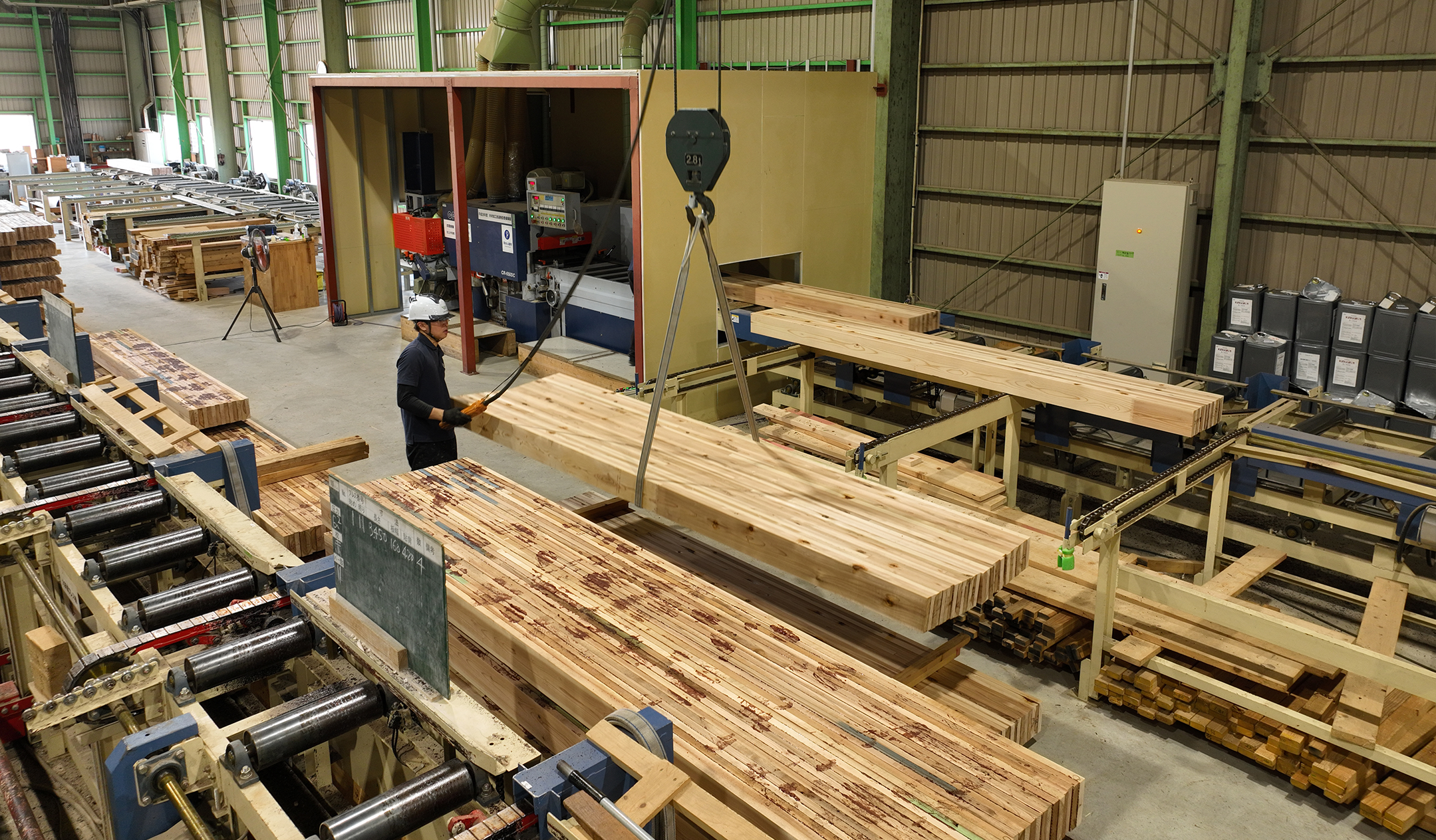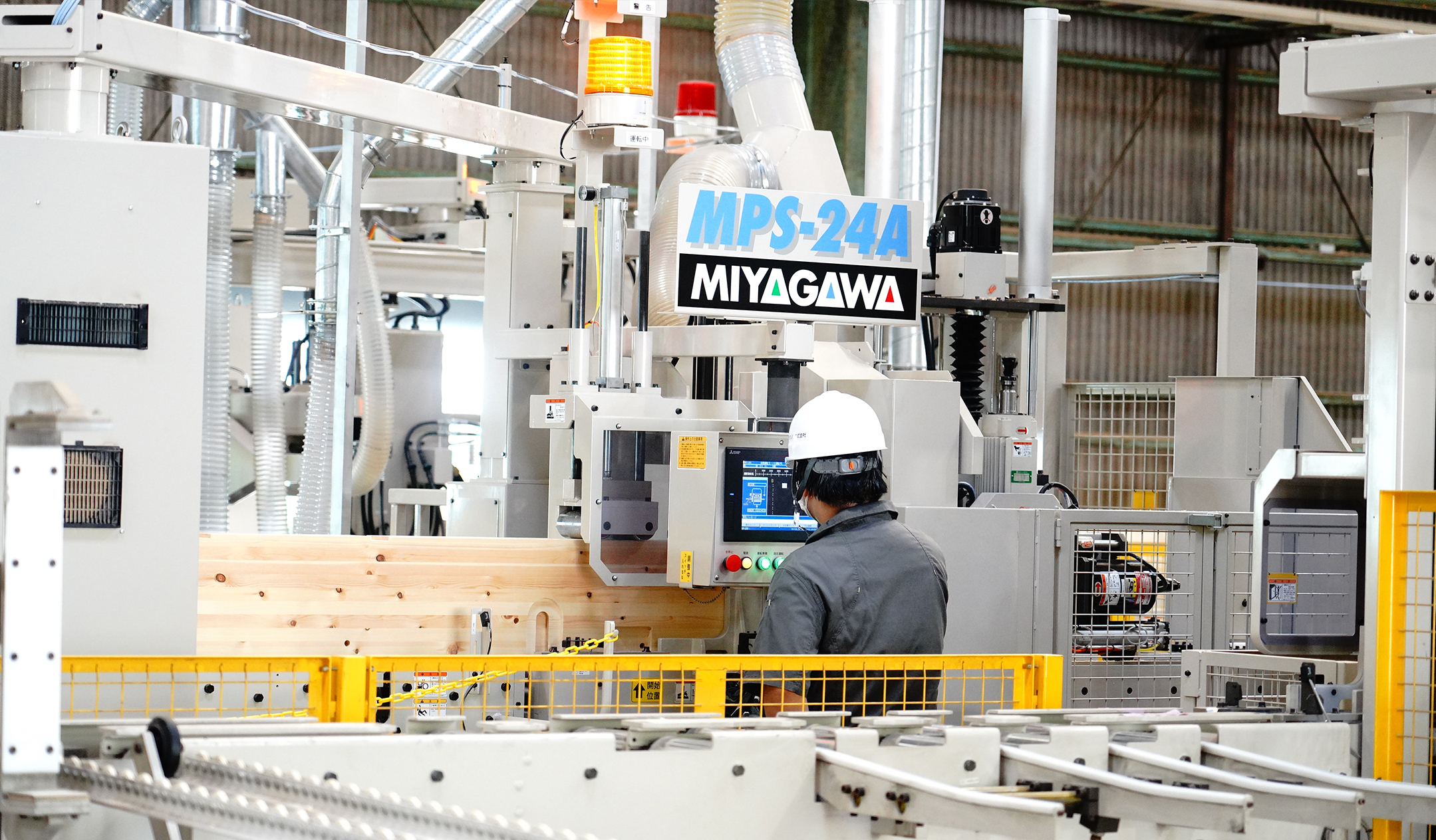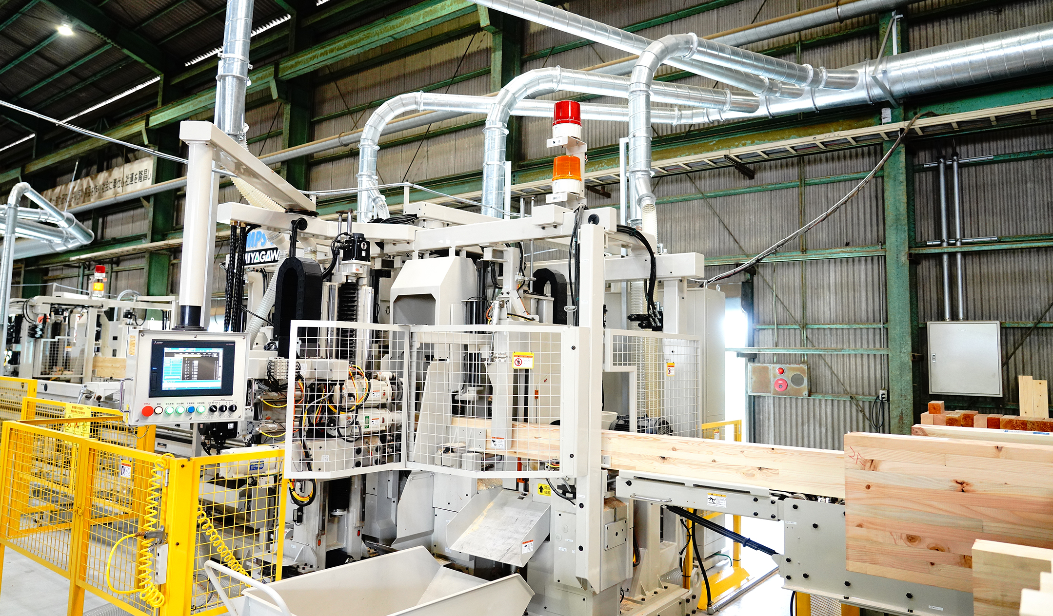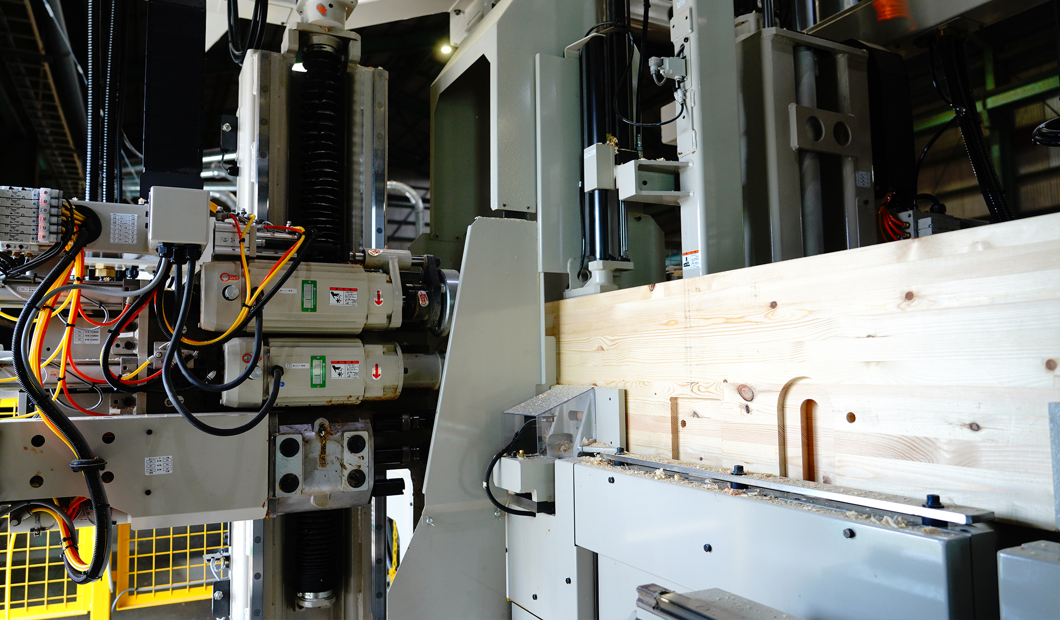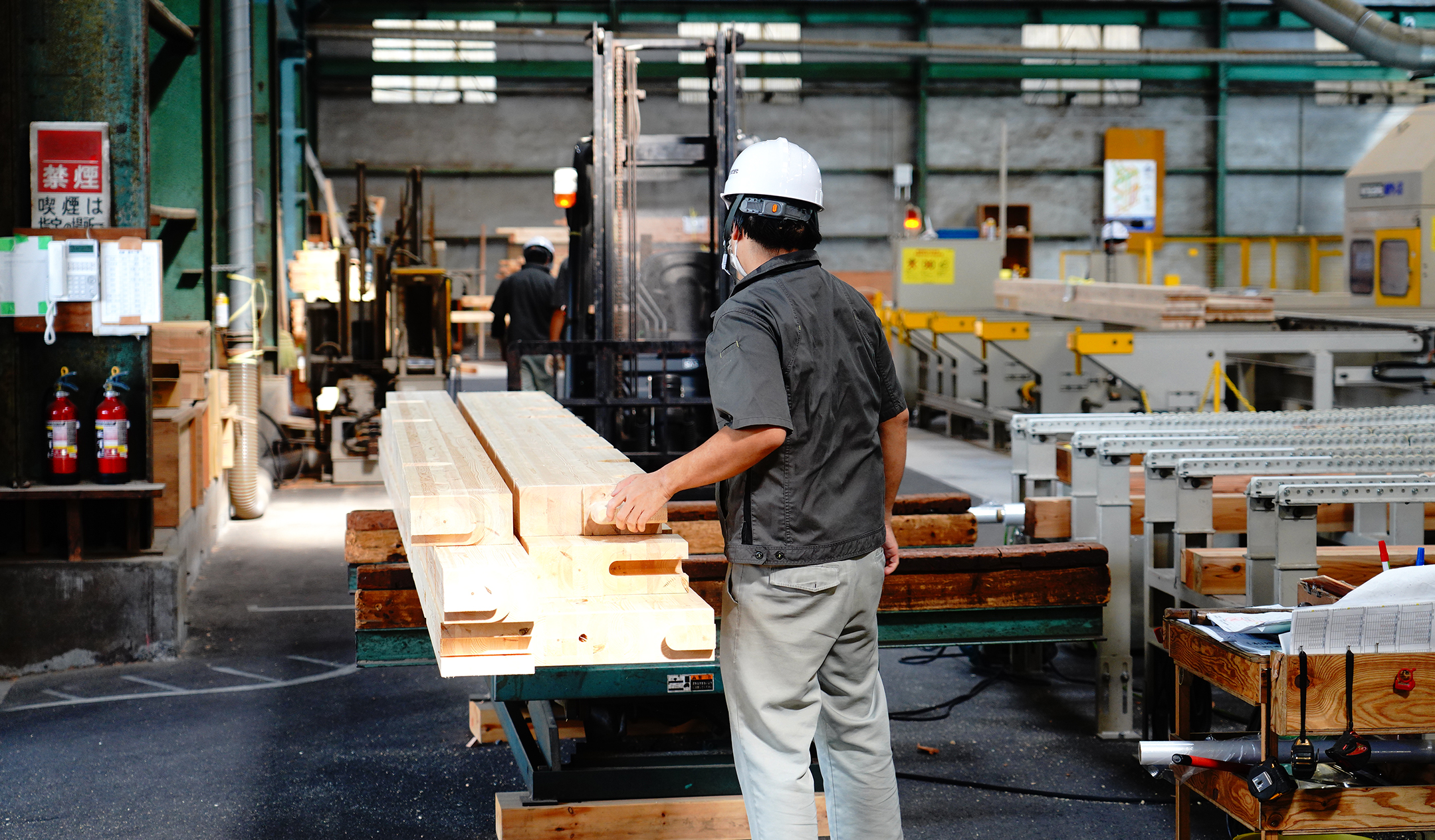 構造躯体の要である横架材を加工。豊富な加工形状と高精度を誇ります。各加工にあたる木材は、全国木材組合連合会に認知された木材選別技術者が一つひとつ細心の注意をはらって選別したものです。