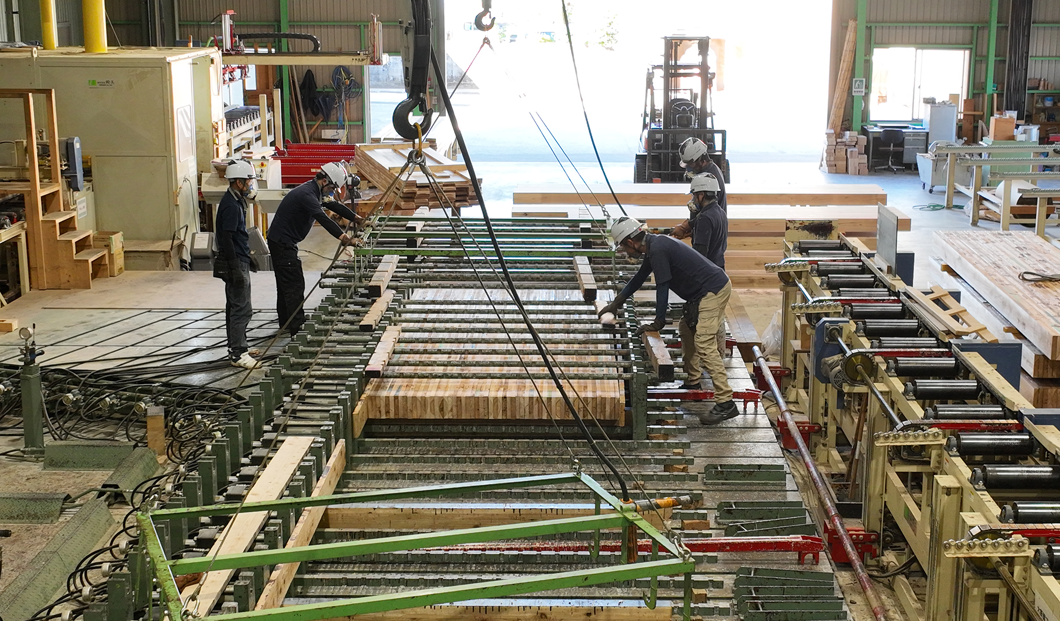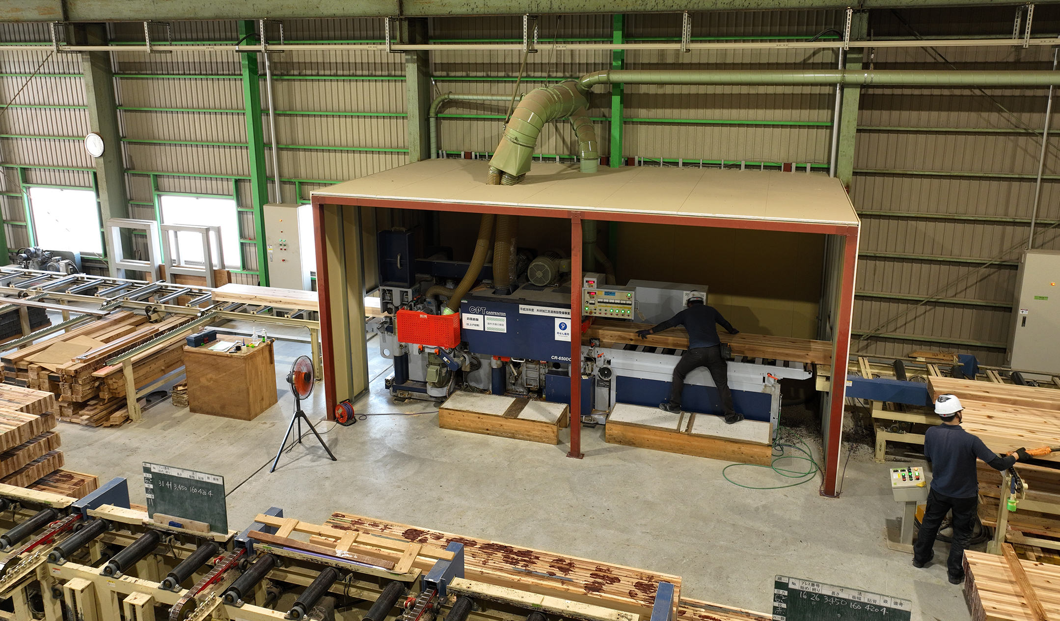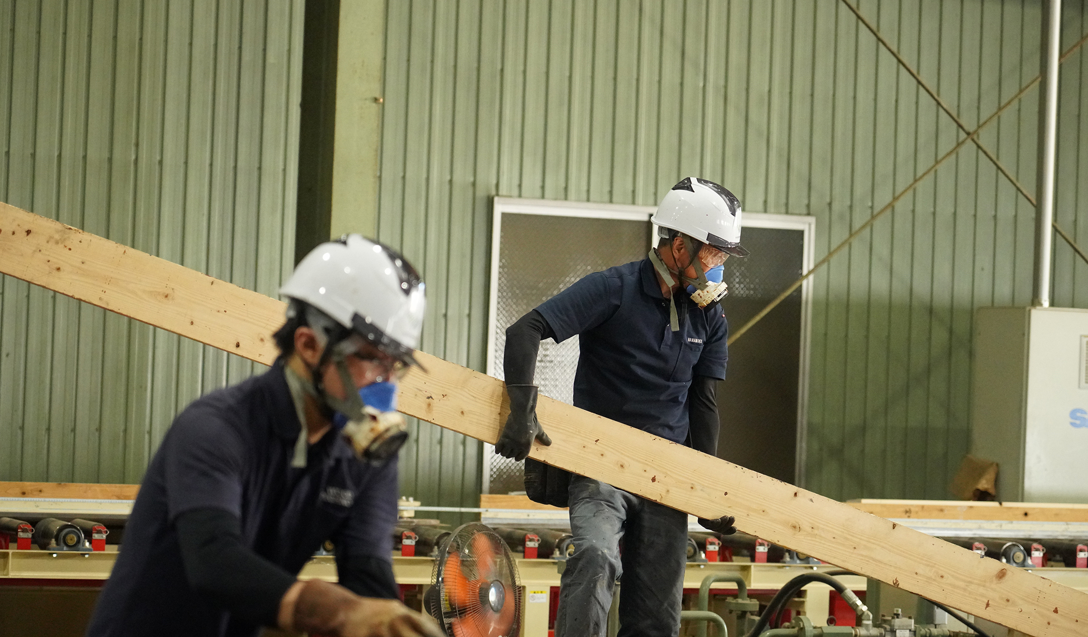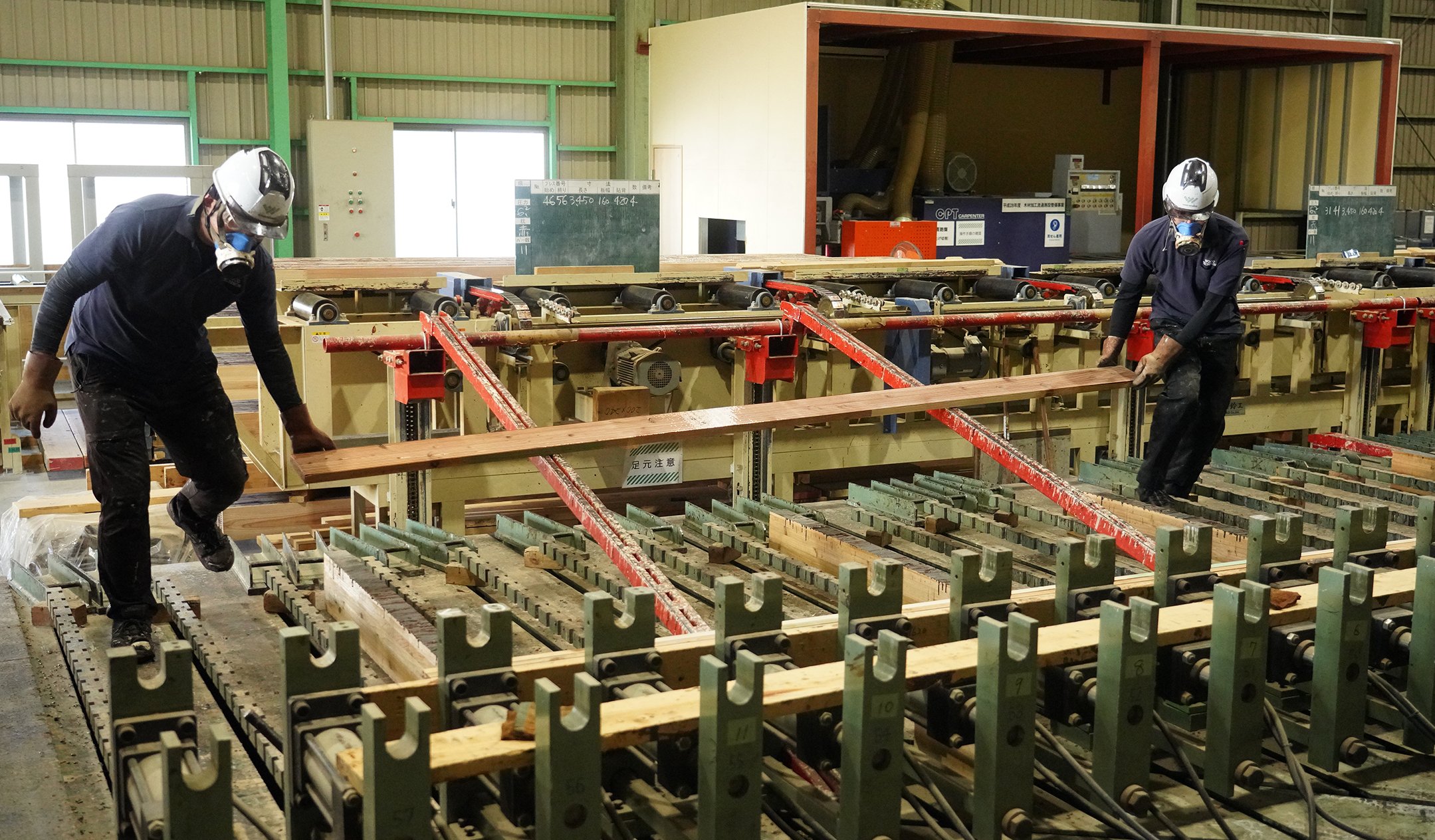 構造躯体の要である横架材を加工。豊富な加工形状と高精度を誇ります。各加工にあたる木材は、全国木材組合連合会に認知された木材選別技術者が一つひとつ細心の注意をはらって選別したものです。