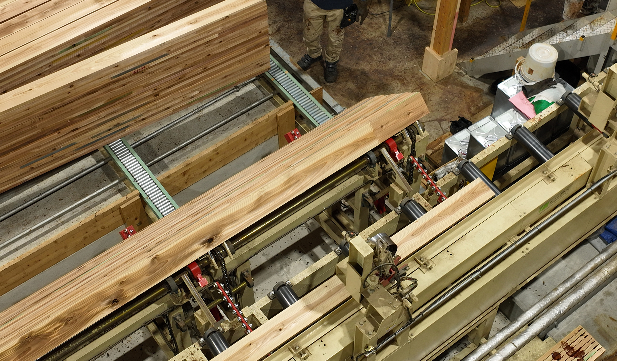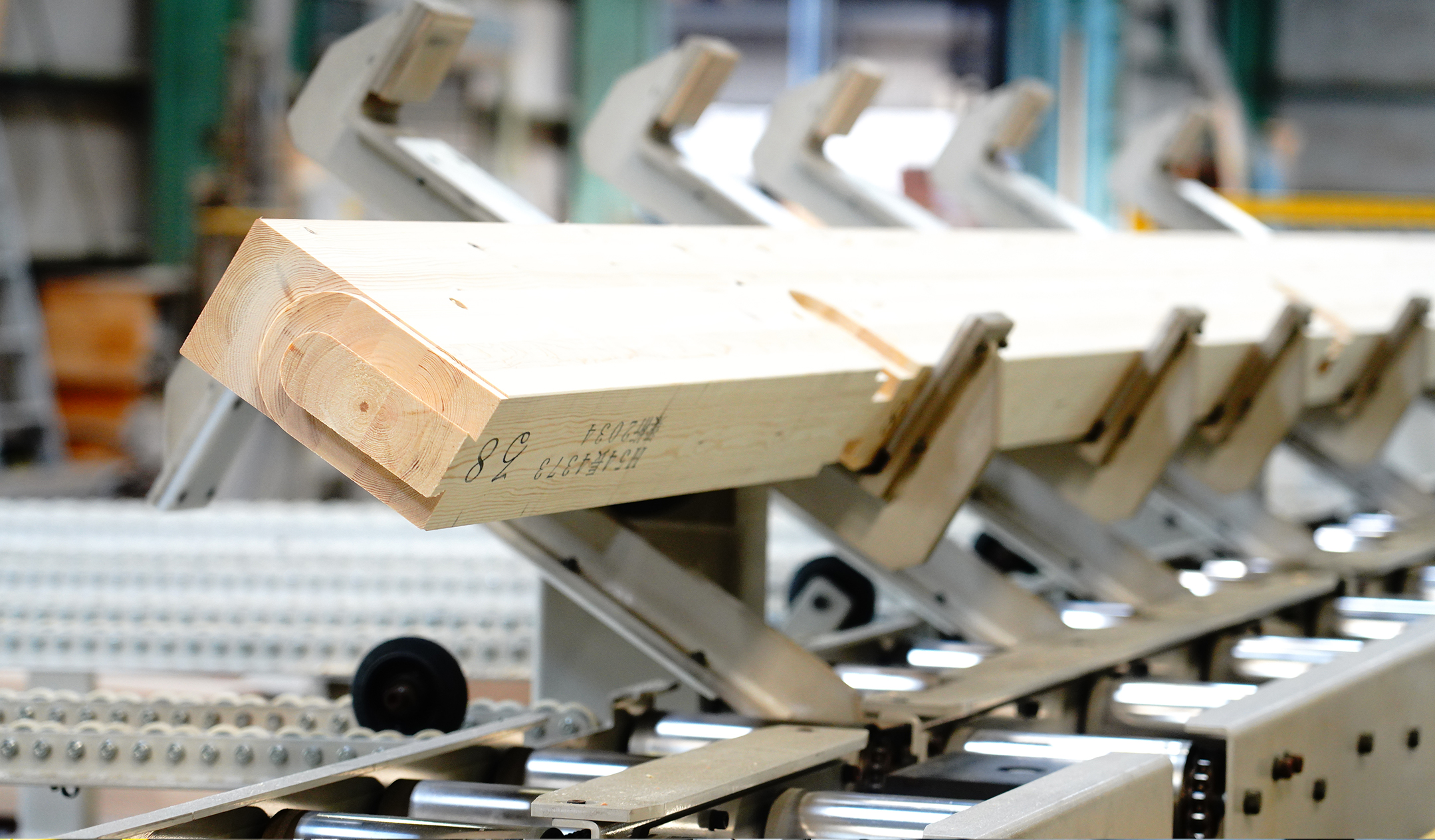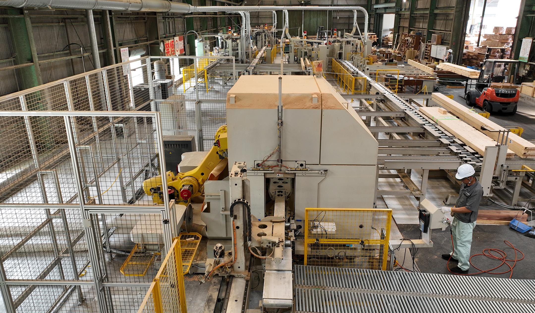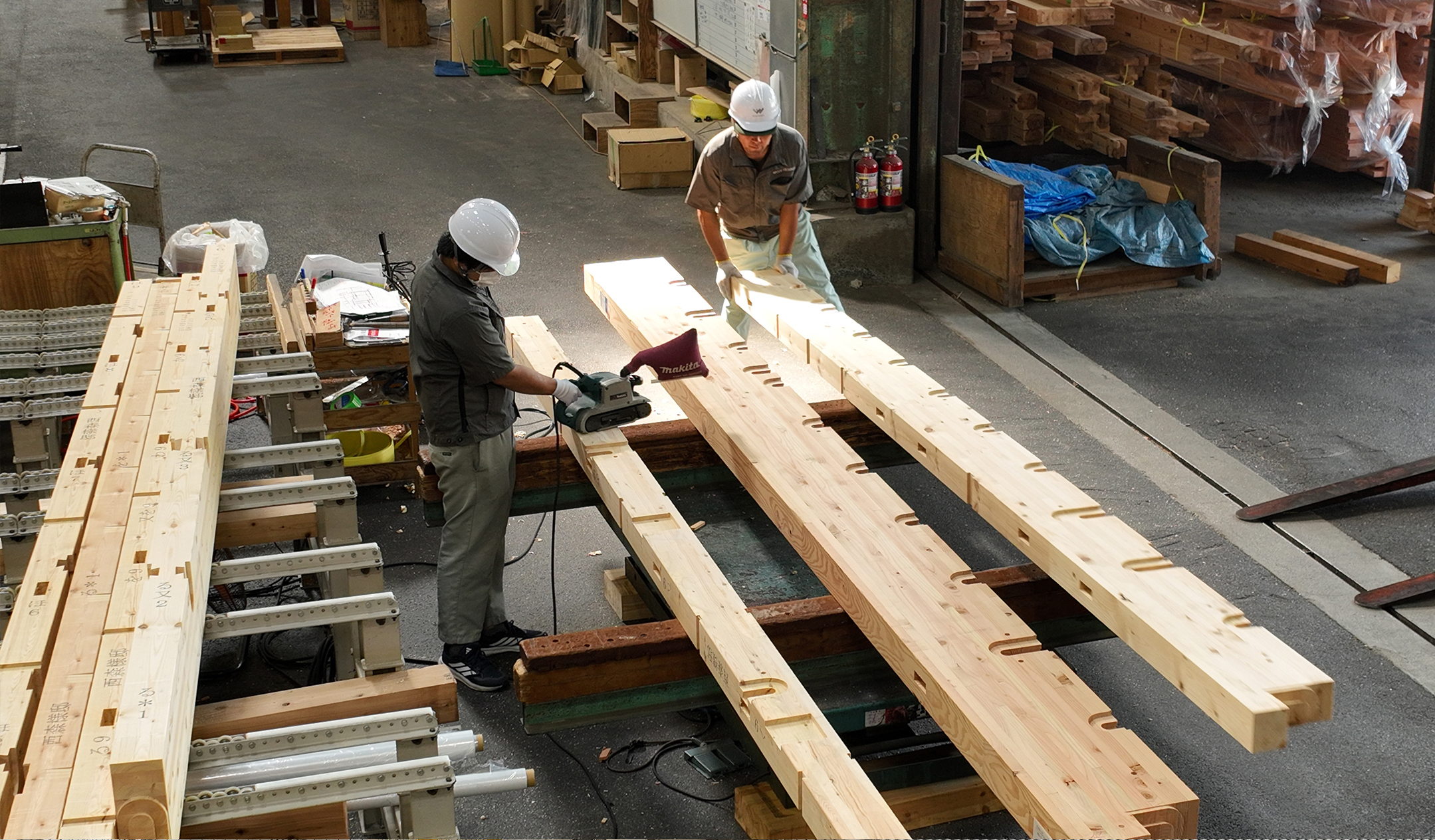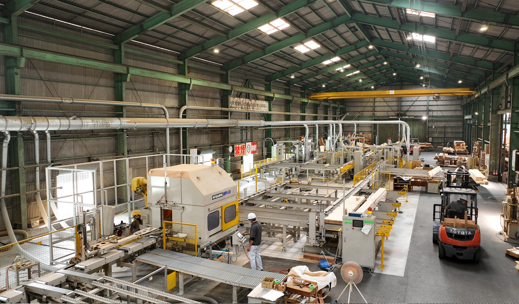 構造躯体の要である横架材を加工。豊富な加工形状と高精度を誇ります。各加工にあたる木材は、全国木材組合連合会に認知された木材選別技術者が一つひとつ細心の注意をはらって選別したものです。
